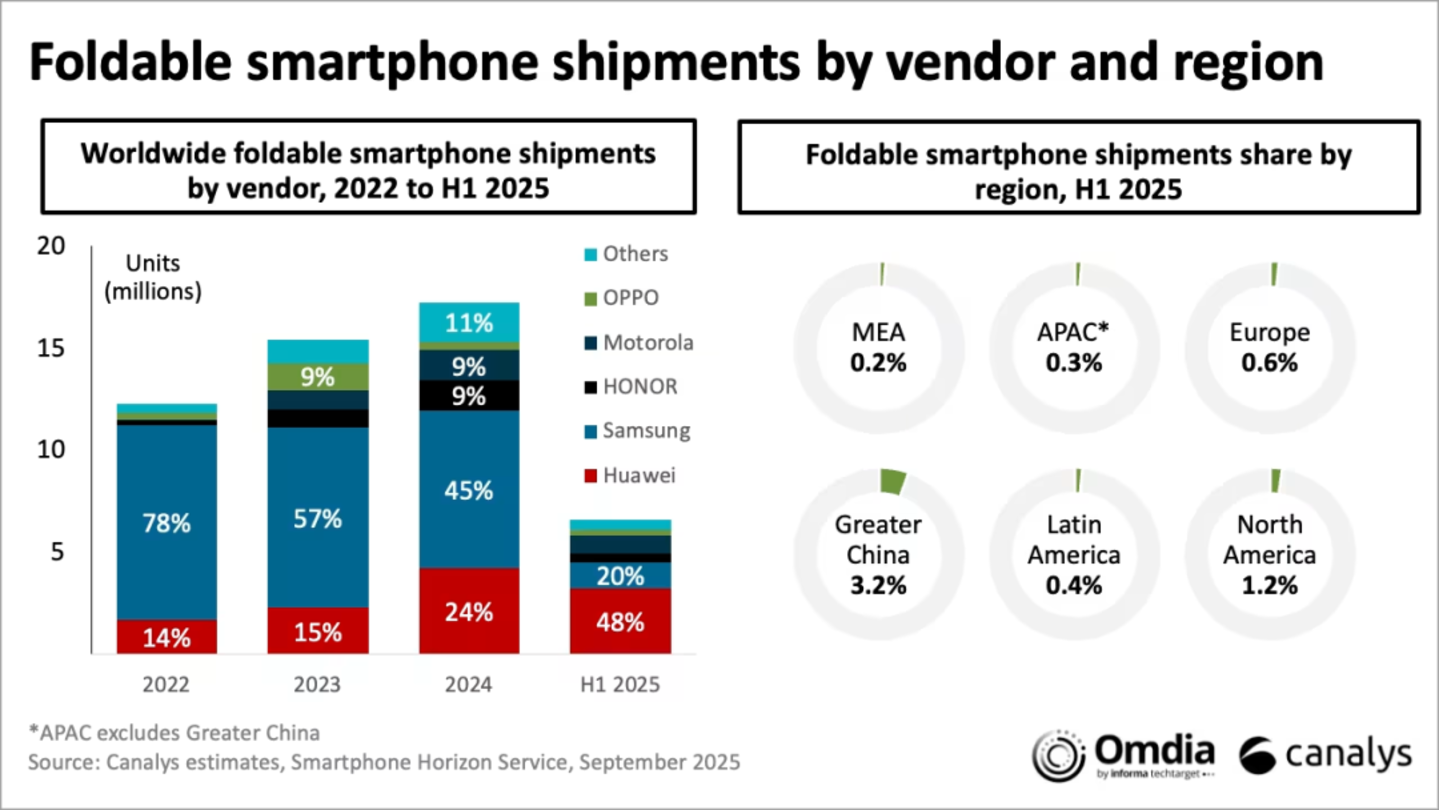 华为在2025年上半年以48%的全球折叠屏出货份额稳居首位,三星以20%的份额位居第二。