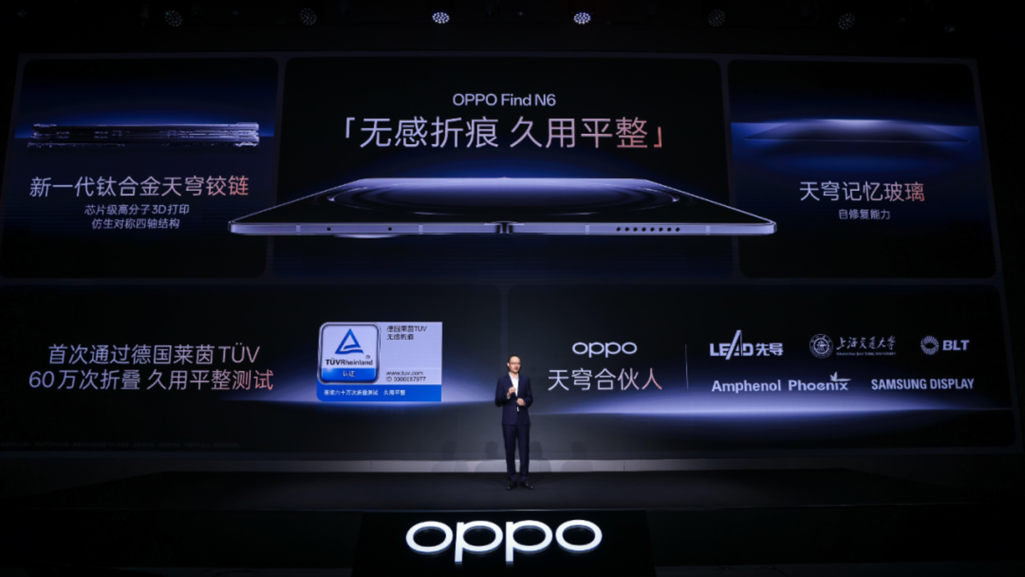 相比之下,OPPO的技术主张要“领先半目”,在Find N6新品发布会上,OPPO牵头成立“天穹合伙人”联盟,引入德国莱茵 TÜV 折叠测试作为背书。